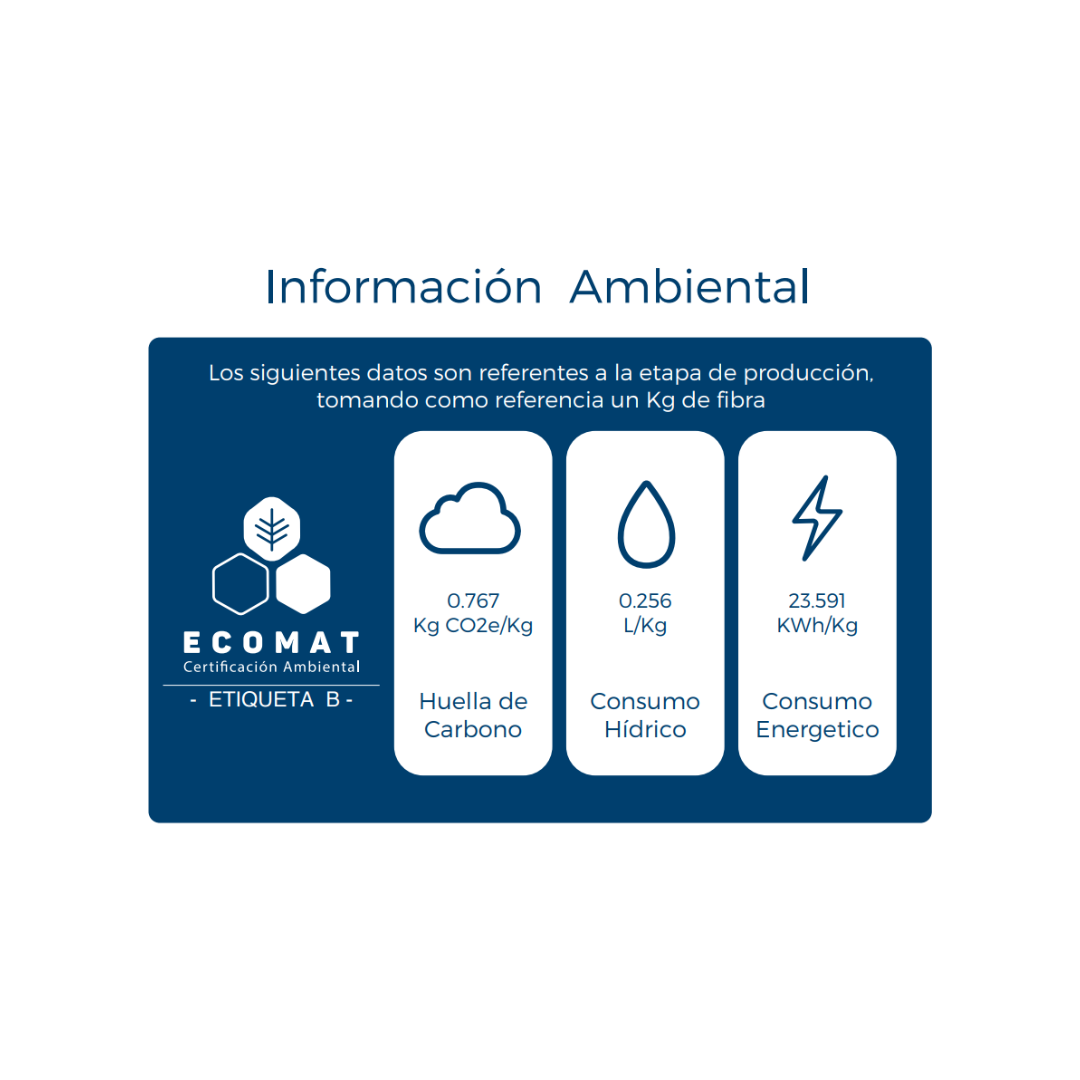 - Consumo Hídrico (0.256 L/Kg): Gracias a nuestra tecnología de circuito cerrado, utilizamos una cantidad mínima de agua en comparación con fibras vírgenes o algodón.