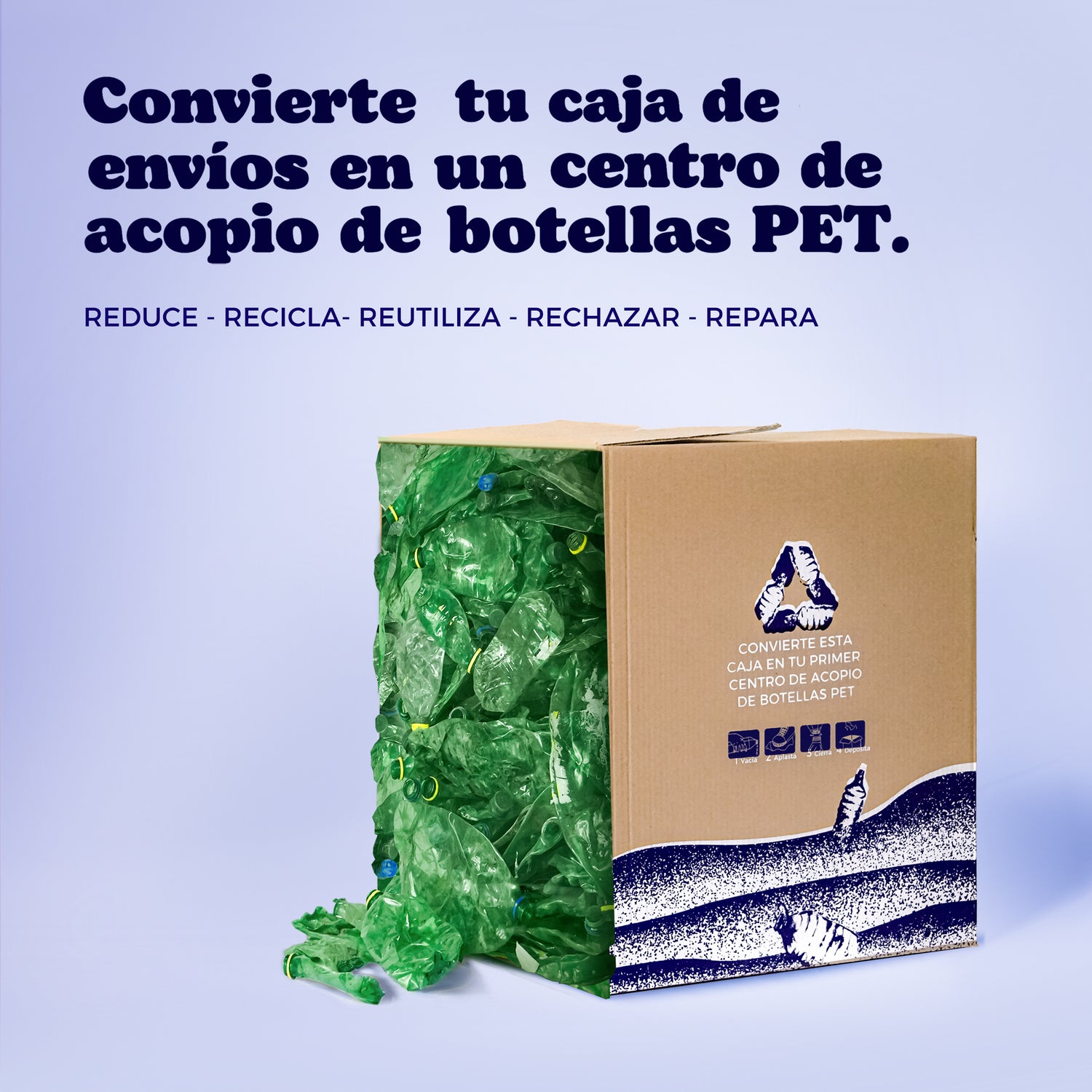 Nuestra responsabilidad no termina cuando recibes tu paquete. Nuestras cajas están diseñadas con cartón reciclado, pero su verdadera función es servirte de herramienta: cada caja tiene el volumen exacto para albergar hasta 375 botellas PET. Te invitamos a usarla como centro de acopio en casa para que, juntos, logremos que más plástico sea reciclado nuevamente.